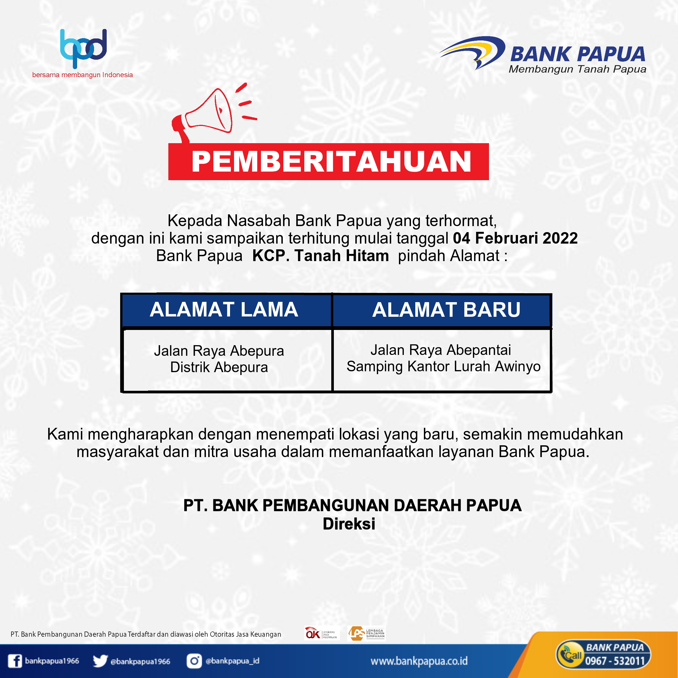 bankpapua_id Untuk meningkatkan pelayanan dengan ini kami informasikan terhitung tanggal 04 Februari 2022, Bank Papua KCP Tanah Hitam pindah alamat ke Jalan Raya Abe Pantai samping Kantor Lurah Awinyo