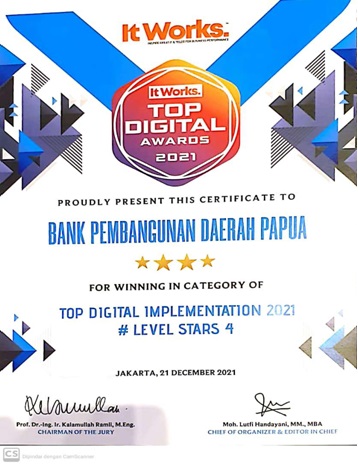 Bank Papua menerima penghargaan 'TOP DIGITAL Implementation 2021 #Level Stars 4' yang diselenggarakan oleh Majalah Majalah ItWorks bekerjasama dan didukung oleh beberapa asosiasi dan perusahaan konsultan TI TELCO/Digital yang merupakan penghargaan tahunan di bidang TI, Telco & Teknologi Digital yang terbesar dan paling komprehensif di Indonesia. Penghargaan diberikan kepada Bank Papua yang telah mengelola bisnisnya secara modern, professional, dan lebih terpercaya dengan mengimplementasikan serta memanfaatkan teknologi informasi dan digital yang lebih canggih, diserahkan pada acara "TOP DIGITAL Awards" pada tanggal 21 Desember 2021