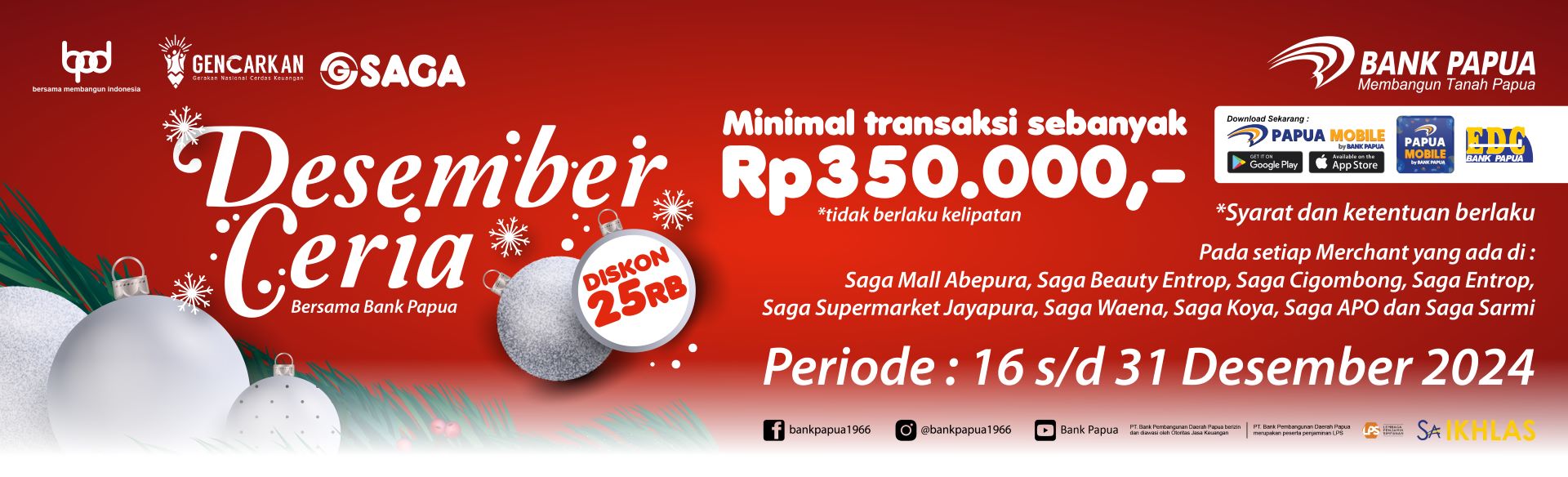 Program Promo Desember Ceria adalah Program promosi dalam rangka memeriahkan momen menyambut Hari Raya Natal dan Tahun Baru sebagai bentuk apresiasi kepada nasabah yang aktif dalam menggunakan layanan EDC Bank Papua dan mengajak nasabah Bank Papua atau Customer Merchant untuk meningkatkan transaksi dengan menggunakan produk dan fasilitas layanan EDC Bank Papua.