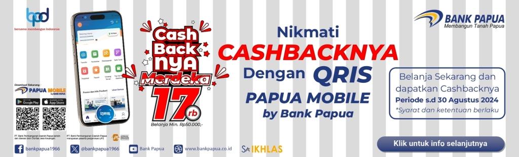 Program Cashbacknya Merdeka adalah Program pemberian diskon atau potongan harga/barang kepada Nasabah Bank Papua yang melakukan transaksi menggunakan produk digital bank papua yaitu Papua Mobile, Qris dan EDC Bank Papua.