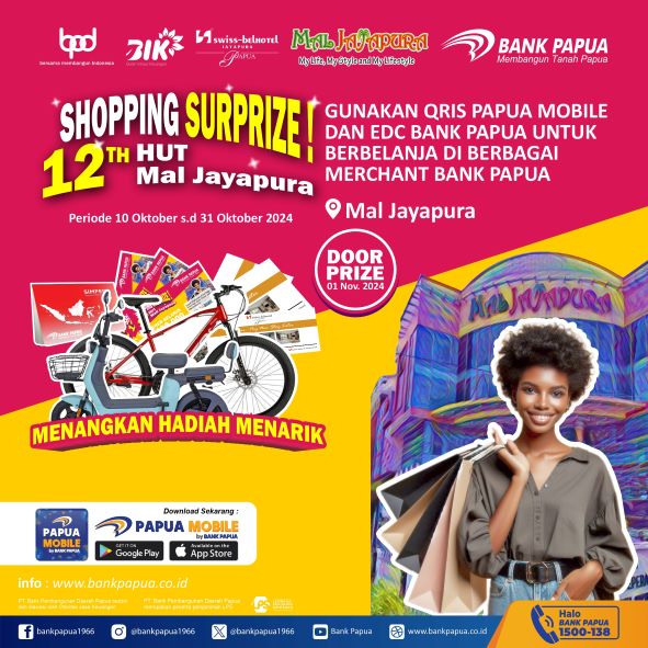 - Untuk memberikan Surprize kepada Masyarakat yang berbelanja di Mal Jayapura dengan transaksi non tunai, Dimana dengan Pengunjung /Masyarakat berbelanja menggunakan Papua Mobile di Merchant Bank Papua dengan transaksi di EDC/ QRIS Statis, struk belanja tersebut ditukarkan dengan kupon hadiah yang akan diundi pada saat ulang tahun Mall Jayapura (1 November 2024).